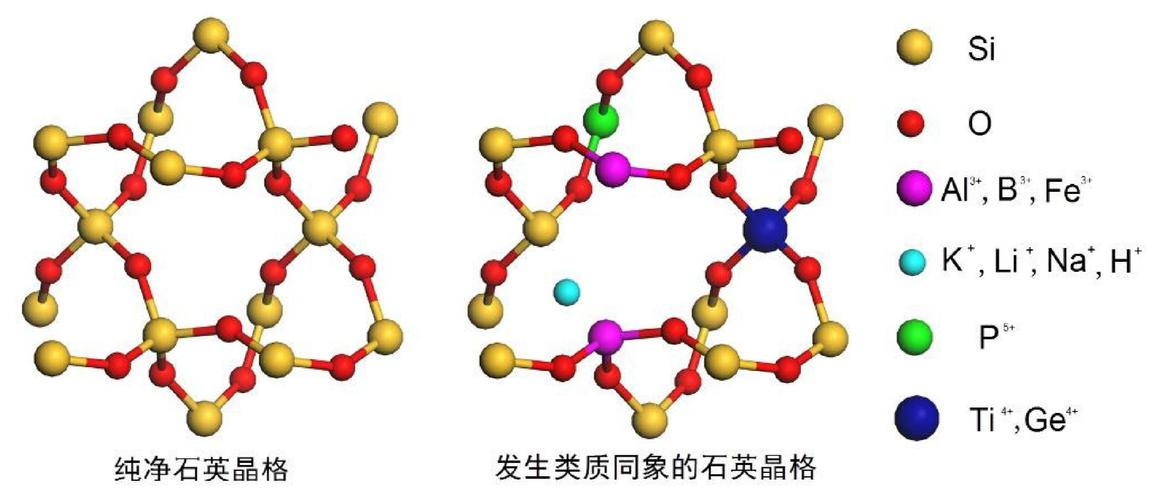 矿物晶体结构中的某些质点(原子、离子或分子)被其它种类与之类似的质点所替代,这种替代一般不会改变矿物的晶体结构和化学键类型,只是使矿物的性质略有改变,这样的现象叫做类质同像。例如大家都很熟悉的矿物石英的晶格中,Si4+常常会被Al3+、Fe3+、B3+、Ti4+、Ge4+和P5+替代。