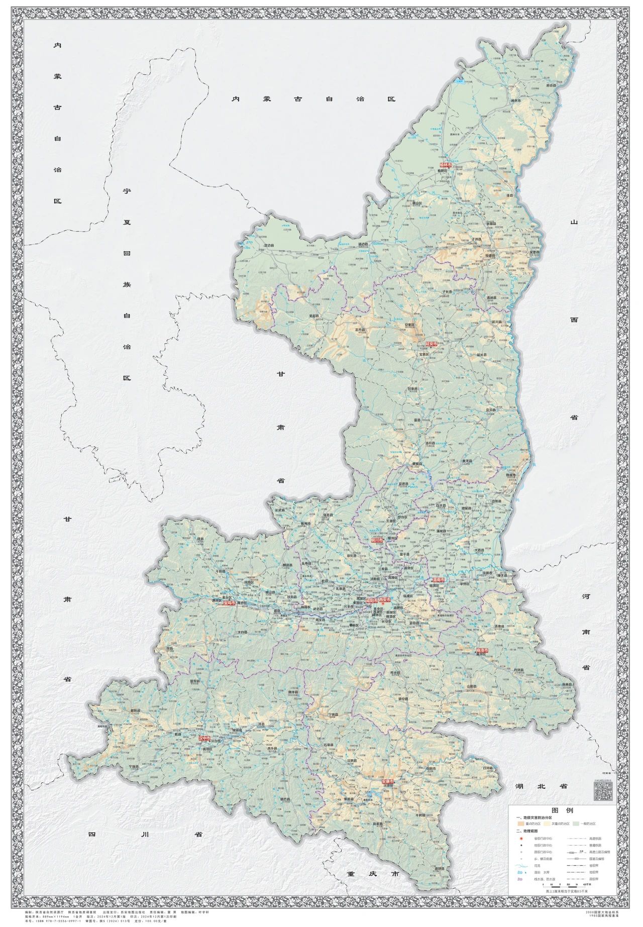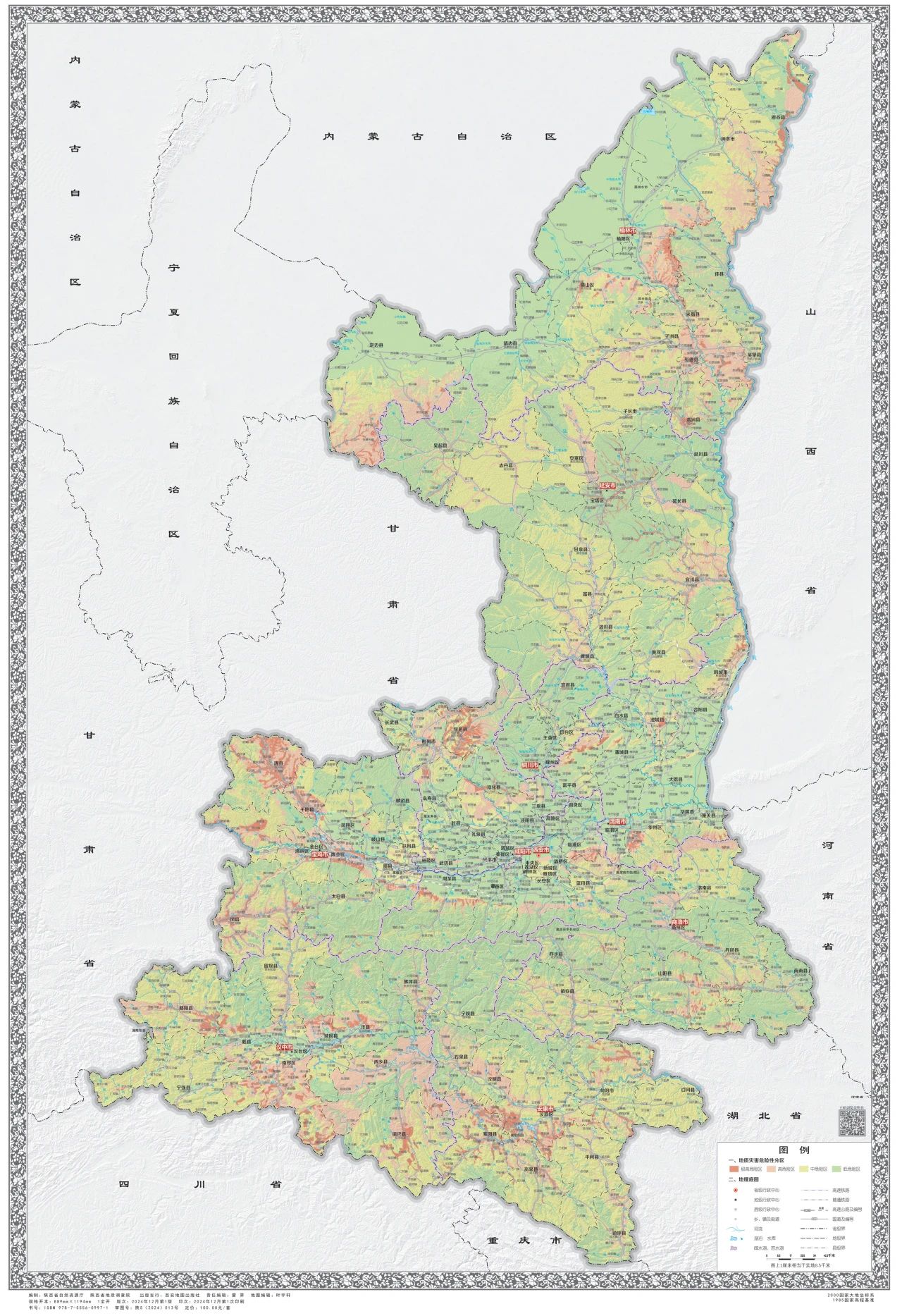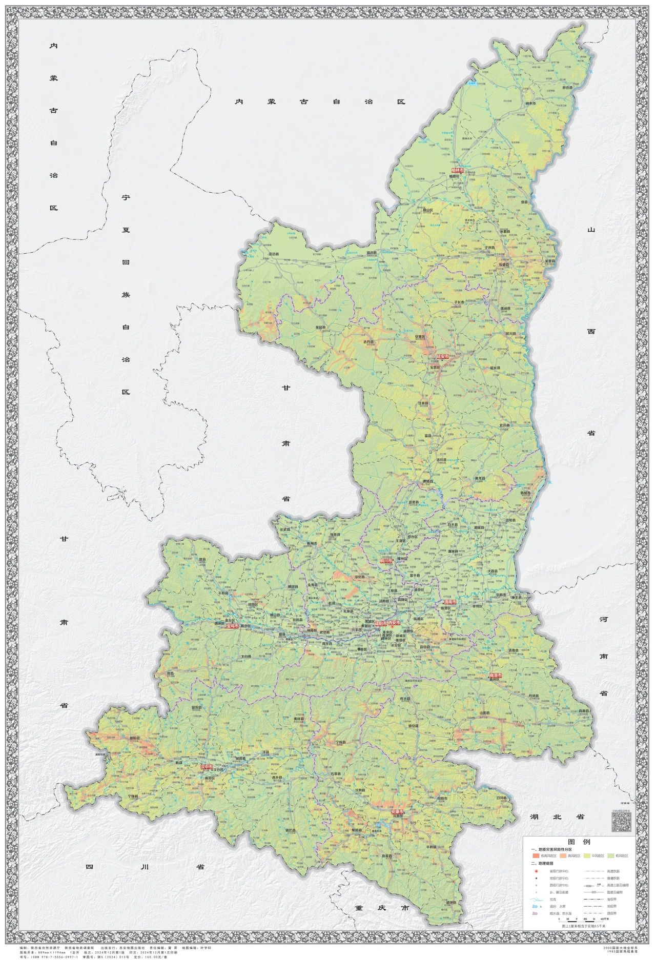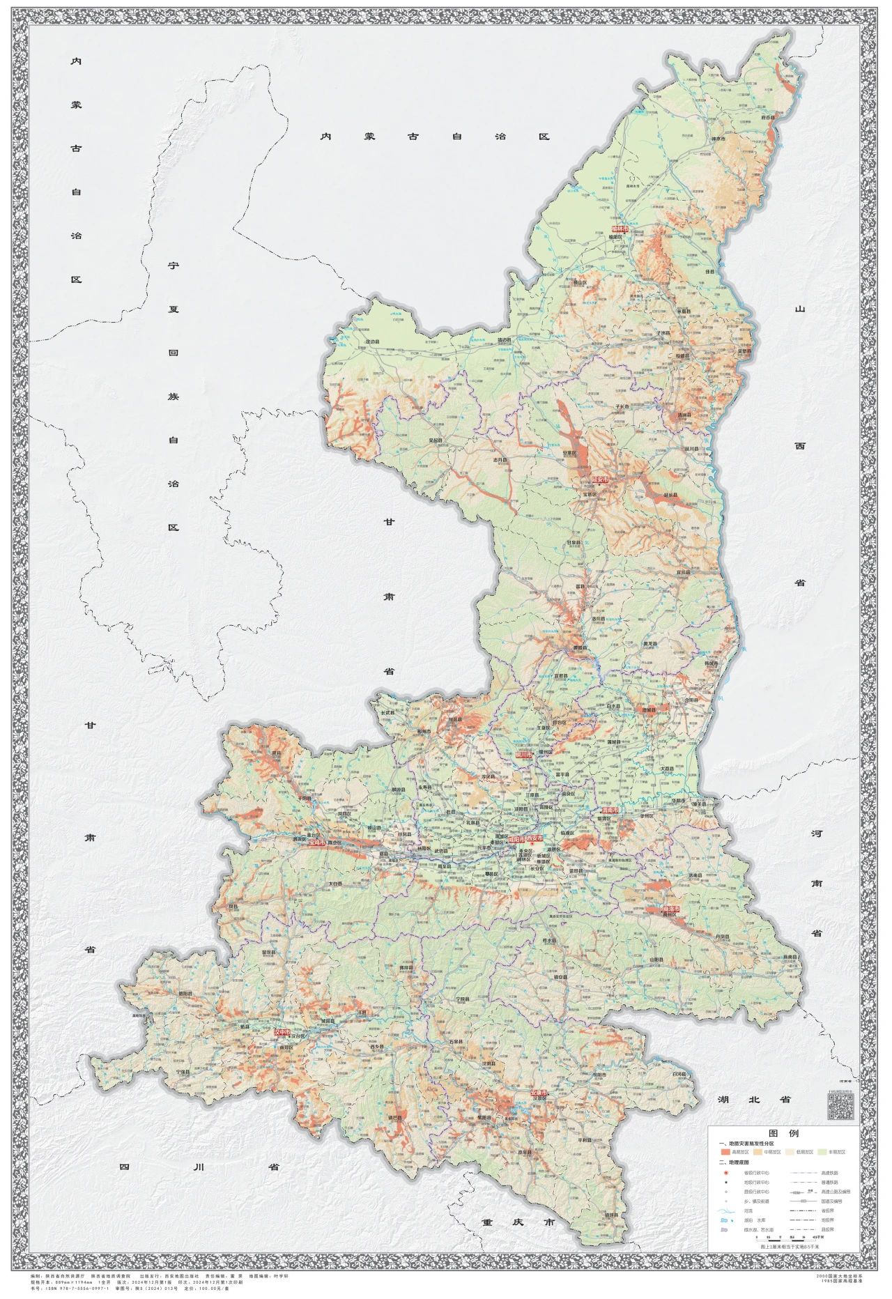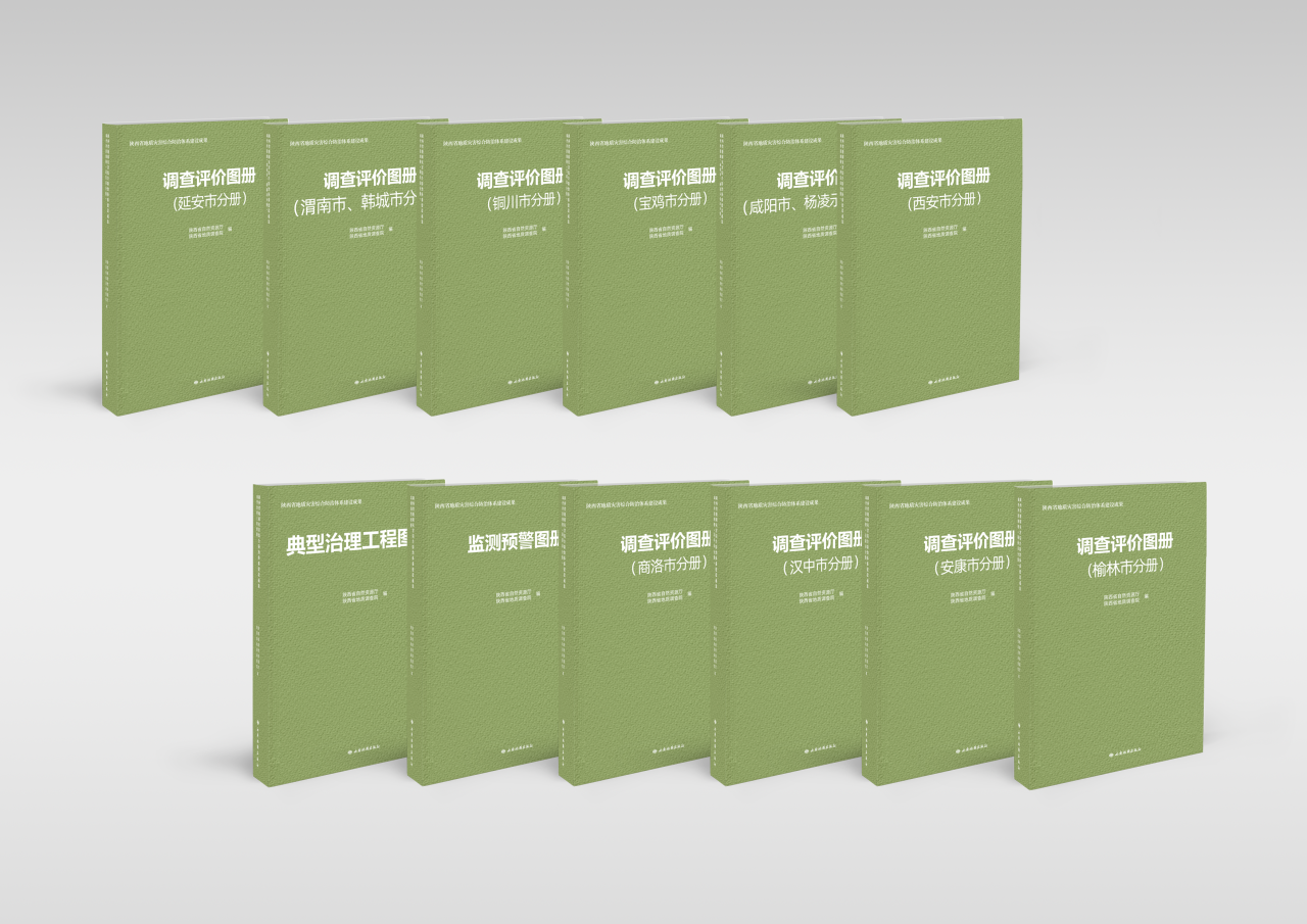 《调查评价系列图册》在综合研究全省1:50000地质灾害风险调查评价成果及风险普查成果的基础上,编制形成了省、市、县三级地质灾害易发性分区图、危险性分区图、风险区划图、防治区划图和说明书。该图册包括省级挂图1套和西安市、宝鸡市、咸阳市(含杨凌示范区)、铜川市、渭南市(含韩城市)、延安市、榆林市、汉中市、安康市、商洛市10个分册,共456张专题地图和117份说明书,系统展现了全省地质灾害风险调查评价成果,为全省地质灾害“隐患点+风险区”双控工作奠定基础。