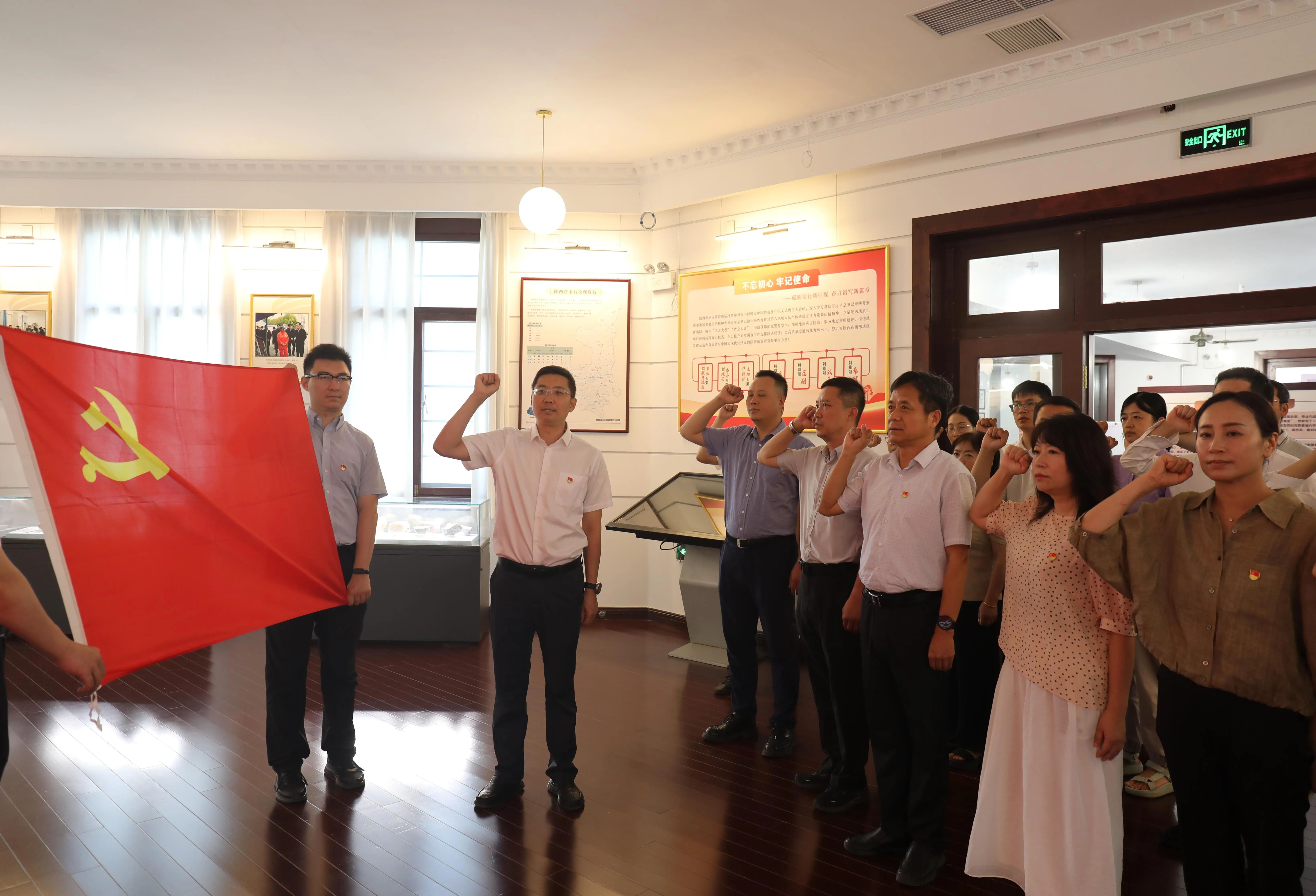活动中,党员首先参观西京招待所情景还原室,通过历史照片、实物展陈与场景复原,深入了解“西安事变”相关历史,感悟革命先辈的坚定信念与艰苦奋斗精神。随后,党员走进地质科技展厅,观摩矿物化石标本和地质调查成果,深刻体会地质工作者“以献身地质事业为荣、以艰苦奋斗为荣、以找矿立功为荣”的“三光荣”传统,学习地质工作者扎根一线、甘于奉献的优良作风和“把论文写在祖国大地上”的科学家精神。参观结束后,全体党员面向党旗重温入党誓词,进一步坚定理想信念。