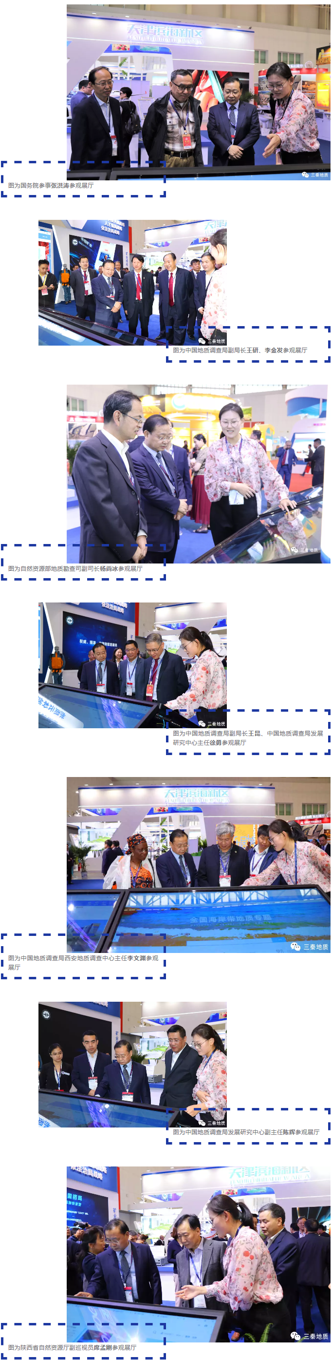 大会期间,天津市长张国清,自然资源部部长陆昊,副部长凌月明,中国地质调查局局长钟自然,国务院参事张洪涛,中国地质调查局副局长王研、李金发、李朋德、王昆,总工程师严光生,自然资源部地质勘查司副司长杨尚冰,中国地质调查局发展研究中心主任徐勇,中国地质调查局总工室主任吴登定,中国地质调查局发展研究中心副主任陈辉,陕西省自然资源厅厅长薛建兴、副巡视员席孟刚,国际地质科学联合会主席、中国地质大学成秋明教授等领导以及中外各界嘉宾来到展厅参观。9323彩集团党委书记、院长洪增林介绍了“地质云·陕西”的建设成果并进行了现场演示。与会领导和专家对“地质云·陕西”给予了充分肯定,一致认为“地质云·陕西”数据资源丰富,技术领先,具有平台优势,应用前景十分广阔。