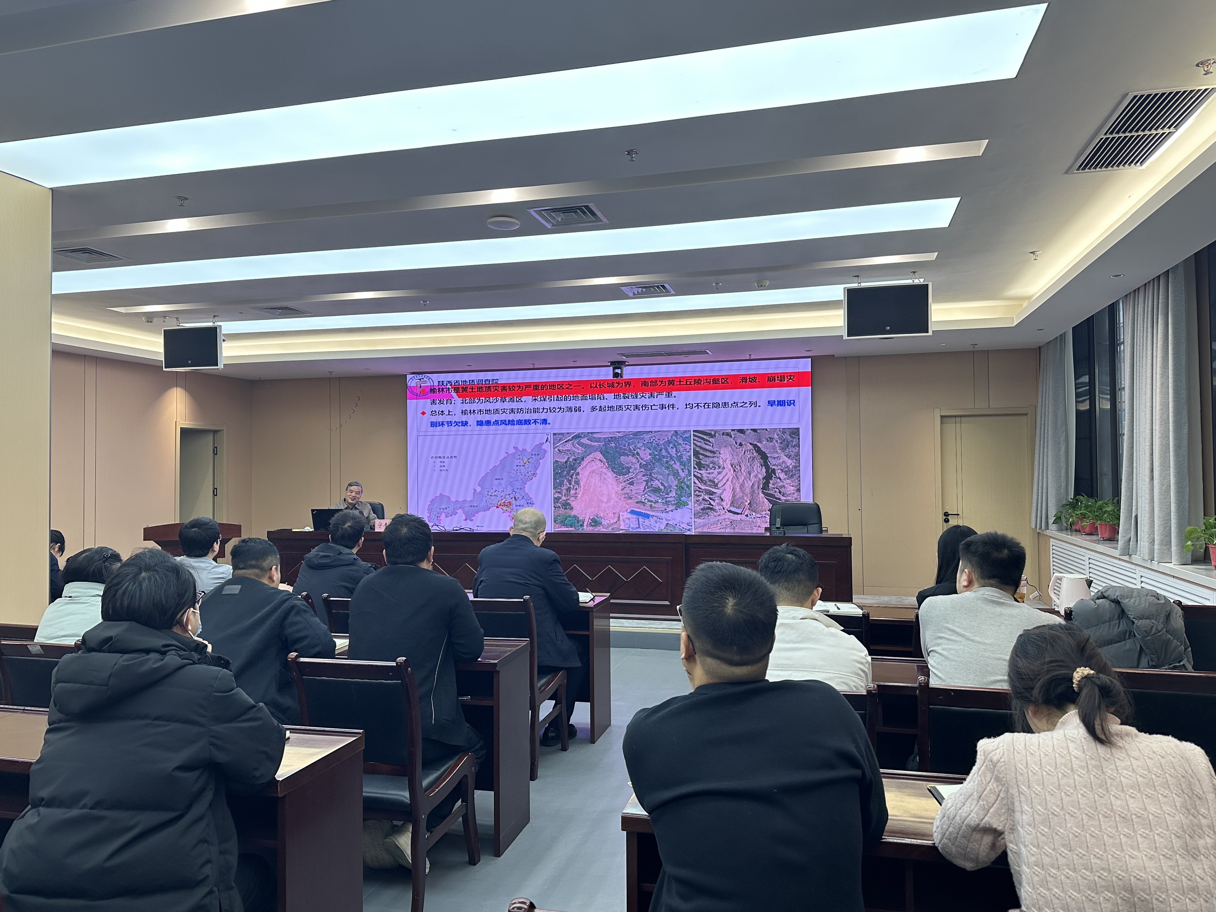 宁奎斌同志结合自身长期从事地质灾害防治工作经验,围绕城镇地质灾害风险调查技术规范要求、黄土地区地质灾害防治、陕北黄土地区典型地质灾害案例分析等方面内容进行了深入浅出地讲解,从基础理论入手,对黄土概念、地层划分、结构特征等基本概念进行了讲解,并结合近年来吴起县、志丹县、子洲县等地发生的多起地质灾害实例,详细剖析了诱发地质灾害的致灾因子和破坏路径,简要分析了黄土地区发生地质灾害的前兆现象及其时空分布规律,提出了防治对策建议。此外,还针对风险调查项目的设计书编制、野外调查实施及成果报告撰写等重点环节进行了讲解辅导。