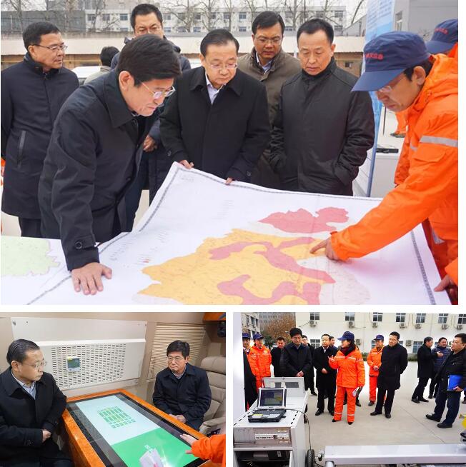 于海峰司长一行首先对省地调院地质灾害防治专业技术队伍工作情况进行了检查,对省地调院近年来配置的三维激光扫描仪、合成孔径雷达、固定翼和旋翼无人机、应急监测车等各类地质灾害调查监测仪器和装备进行了现场调研。