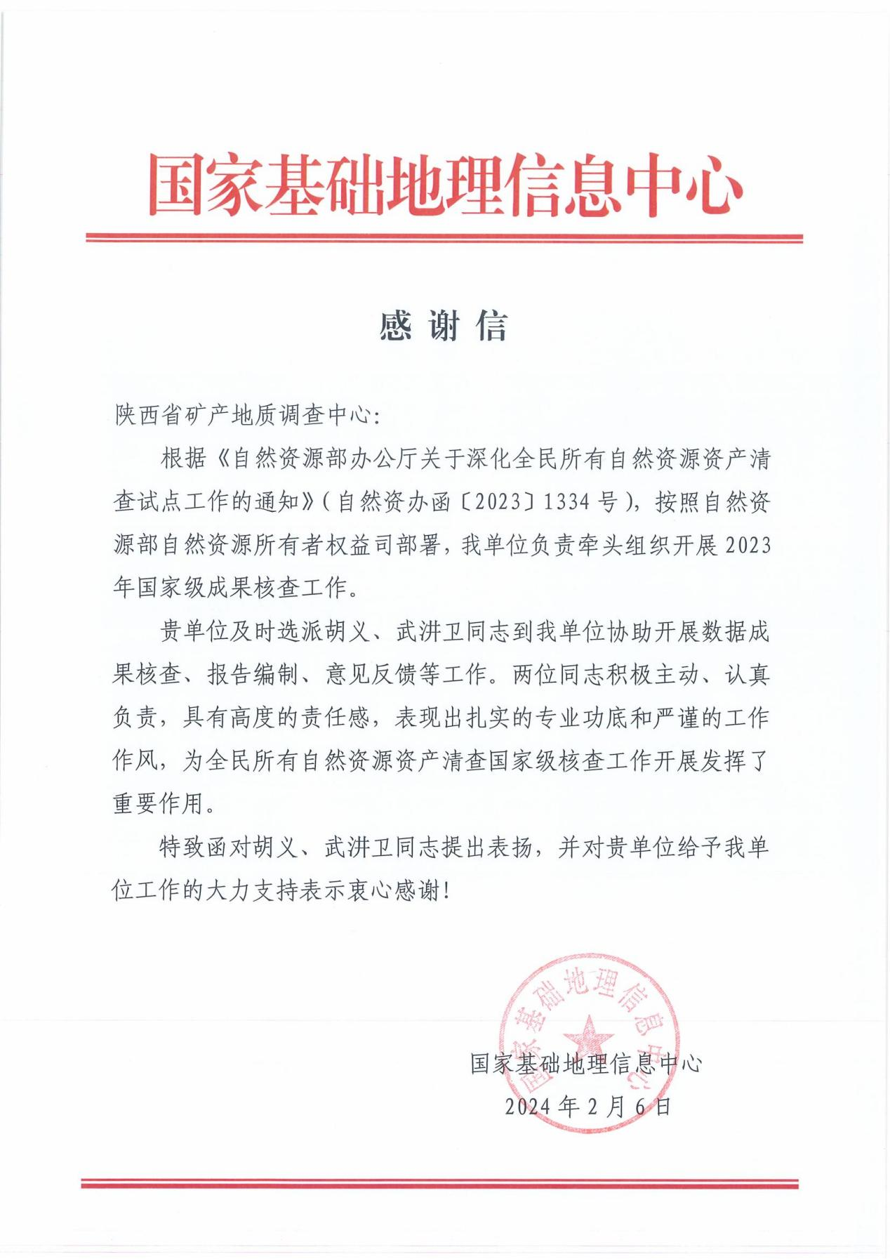 感谢信中强调,在国家基础地理信息中心牵头组织的2023年国家级成果核查工作中,省地调院矿产中心选派的胡义、武汫卫两位同志积极主动、认真负责,具有高度的责任感,表现出扎实的专业功底和严谨的工作作风,为全民所有自然资源资产清查国家级核查工作发挥了重要作用,对两位同志特提出表扬,并感谢省地调院对该项工作的大力支持。