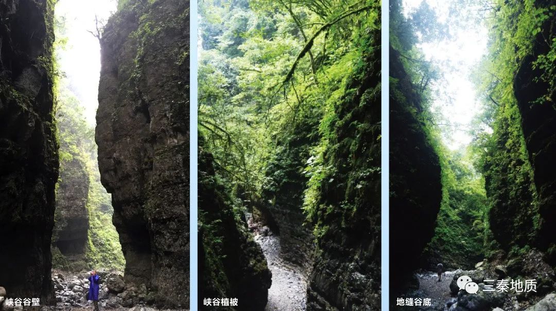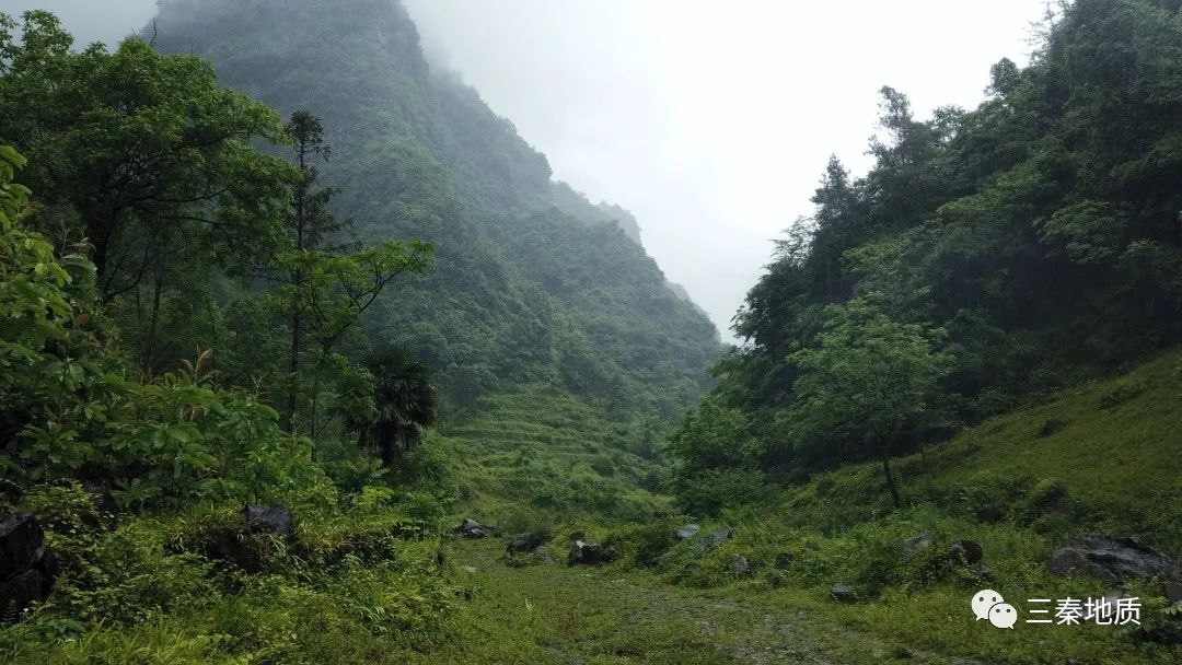 31日,风雨阵阵,科考专家组先行考察了回龙沟地缝的地层岩性特征及其形成发育条件,驻足听取了省地调院专业人员对该地古生物化石、生物多样性等有关情况介绍。考察点峡谷蜿蜒,河道狭窄。崖如斧劈刀削,险峻幽深,泉水流瀑挂壁,怪石峥嵘。崖壁溶蚀现象丰富,植被繁盛葱郁。