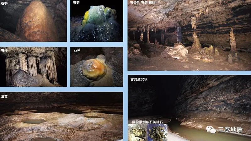 雨如烟,雾渐起,专家组驱车前往大佛洞考察点,窗外云雾缭绕,青影窈窕,行至深处,仿若游走于一幅水墨丹青画卷之中,宛若仙境。大佛洞洞内岩溶发育,沿着洞穴一路深入,专家组考察了洞道形态、洞穴溶蚀形态、石钟乳、石笋、石柱等岩溶发育程度以及洞内古河道沉积物。省地调院专业人员向各位专家学者介绍了在洞内已开展的石英砾石获取宇宙成因核素26Al/10Be埋藏年龄的研究成果,获得专家们充分肯定。