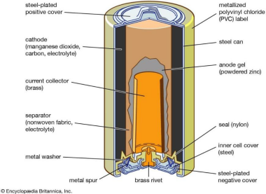 一种常见的电池构型为:内部为胶状锌粉糊,外部为含有二氧化锰、碳粉及电解质的正极糊。碱性锌锰干电池是日常生活中应用最广的一类干电池。