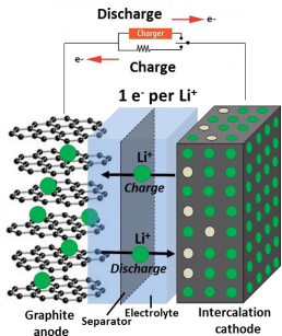 常见锂离子电池是以石墨为负极,钴酸锂为正极,含锂有机溶液为电解液制成的二次电池。锂电池在充放电时,锂离子会在正负极间不断迁移,类似摇椅,因此锂电池也被称为“摇椅式电池”。由于其较高的容量、安全性,锂电池已被广泛应用于手机、电脑、移动设备等3C产品中。