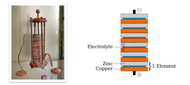 伏打电堆是可确认的最早被发明出的电池,由亚历山德罗·伏打在1799年发明。伏打电堆的正极是铜或银,负极是锌,其间以浸透稀硫酸或卤水的布或纸板作为电解质层,放电时发生典型的铜锌原电池反应。其称作“电堆”的原因是,伏打电池是由多个单体电池单元重复堆放构成的电池组。至今“电堆”这个概念也仍然在燃料电池等领域。
