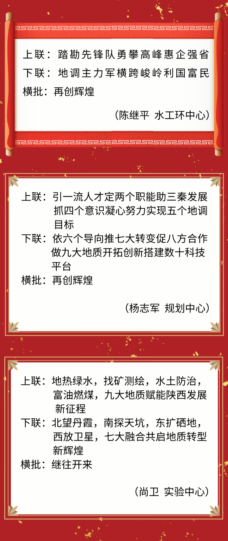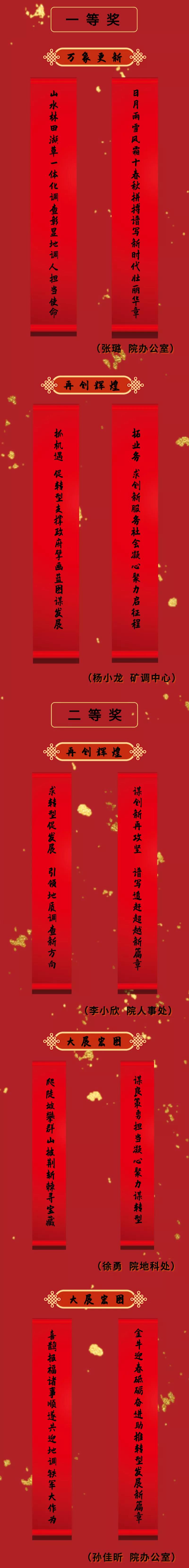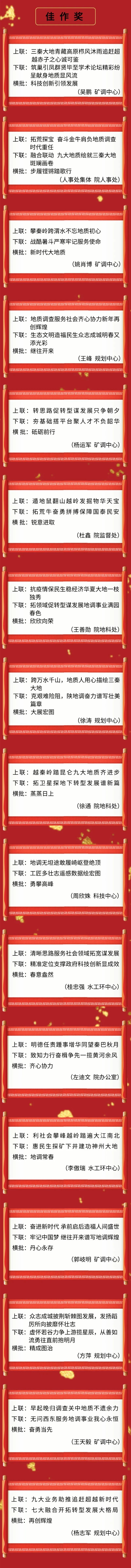 地调铁军多才俊,美好愿景寄春联。值此2021新春佳节之际,9323彩集团面向全院干部职工开展了春节楹联征集活动。广大干部职工积极参与投稿,活动共征集到楹联48副。这些楹联作品紧扣时代脉络,内容积极向上,充满浓厚的时代气息和地调文化特色,展现了陕西地调人对公益性地质调查工作的高度责任感、使命感和攻坚克难、锐意改革、奋发有为的精神风貌,传递出全院干部职工喜迎佳节、积极参加文化活动的健康情趣和对陕西地调事业迈出新步伐的美好祝愿。“鼠”实不易蒸蒸上,“牛”转乾坤日日新。让我们在这些春联佳作营造的积极向上、热烈祥和的新年气氛中,感受省地调院高质量转型发展新气象,共创陕西地调事业美好明天!