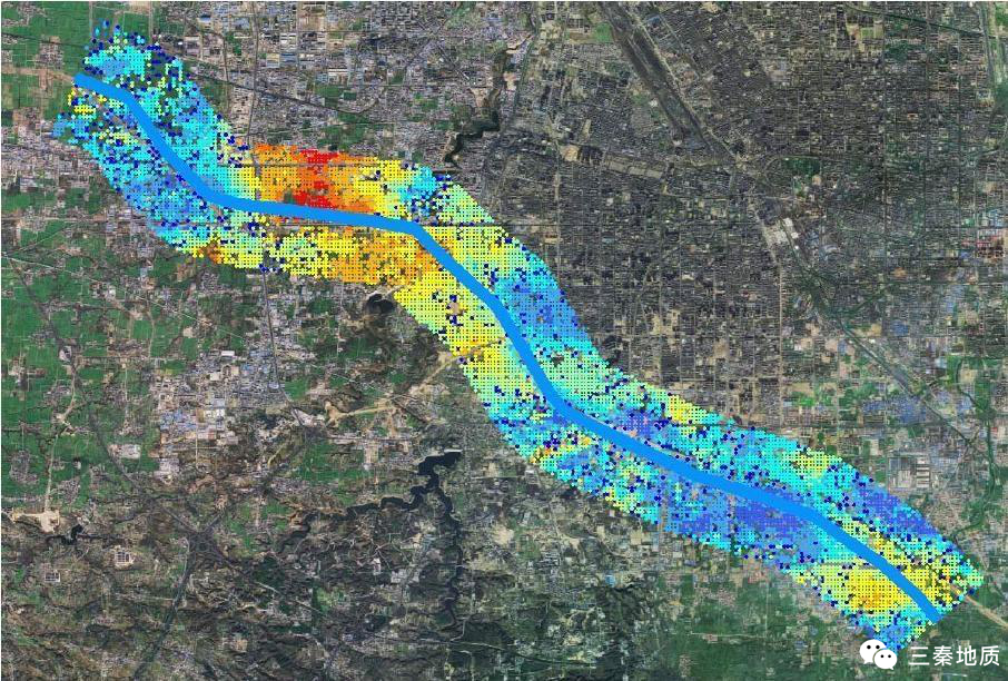 关中某地InSAR地面沉降分析图(红色表示沉降速率大)