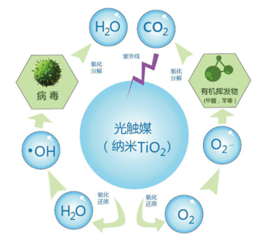 光催化适合室内挥发有机物的净化,可用在空调过滤器中来分解甲醛、苯、氨气等有害气体。光生空穴的能量达到3.0eV,相当于15000度温度的能量,能够破坏大部分化学键,将有机污染物分解为二氧化碳和水,杀灭病毒和细菌,去除异味,实现室内空气净化。