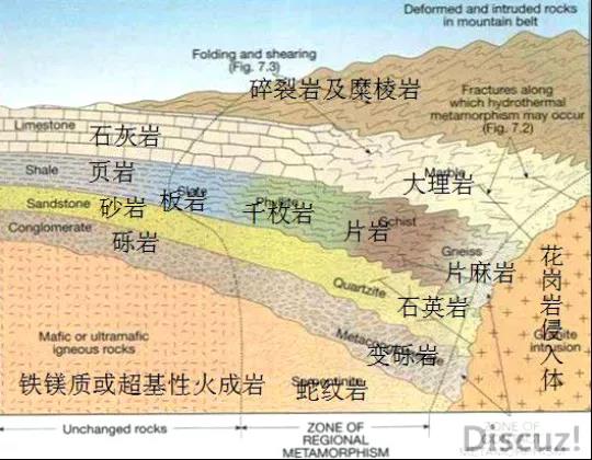 区域变质作用是最为普遍的变质作用,在区域变质过程中,随着温度、压力的增高,变质加深,原岩依次变质成为板岩、千枚岩、片岩、片麻岩等岩石。