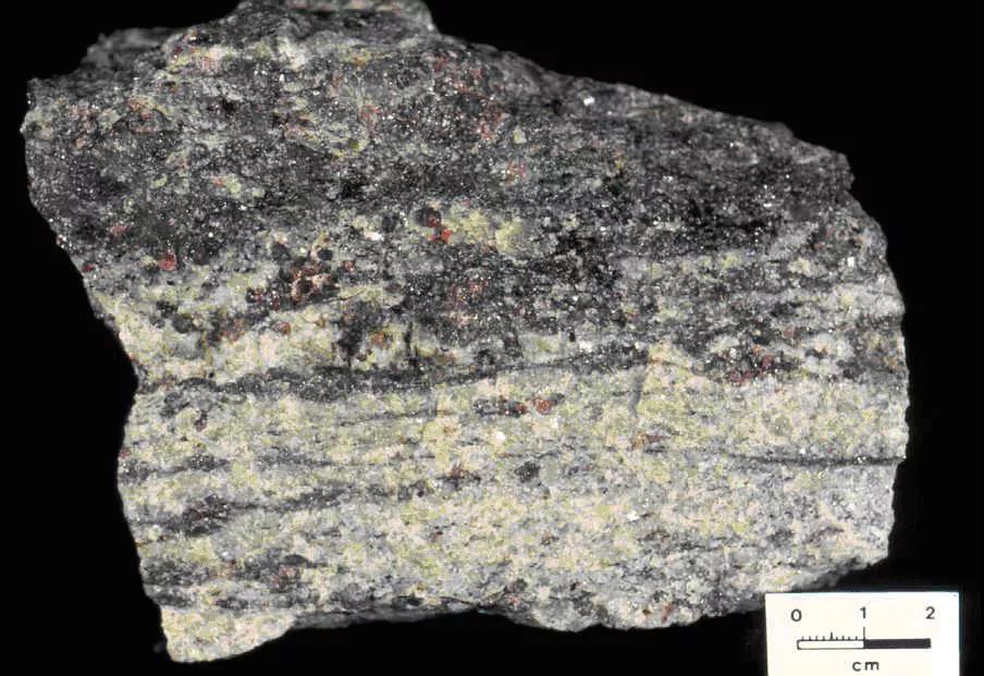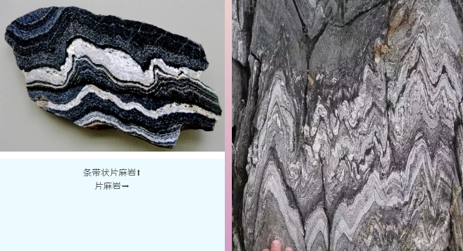 片麻岩的颗粒较粗,有些含有大量石英和长石。片麻岩上的条状是由岩石中不同比例的矿物分布形成的,比如深色条带中含镁铁质矿物,浅色条带中则含长石、石英物质较多。另外,颗粒大小也可产生“一黑一白”条带状。片麻岩分布很广,可用做建筑石料、铺路石等。正片麻岩是火成岩变质后形成的,而副片麻岩则是由沉积岩变化而来。