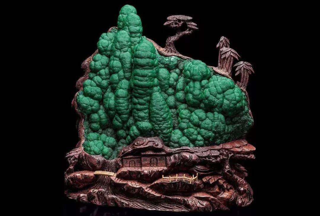 现代作品中,清代极盛的孔雀石山子也沿袭下来,成为常见的摆件,颜色与造型浑然一体,树木和楼台构成远景和近景的交替变化。古树参天,苍松繁茂,山石层叠,屋舍隐约,木雕与孔雀石颜色相映成趣,雕工精湛,浑然天成。