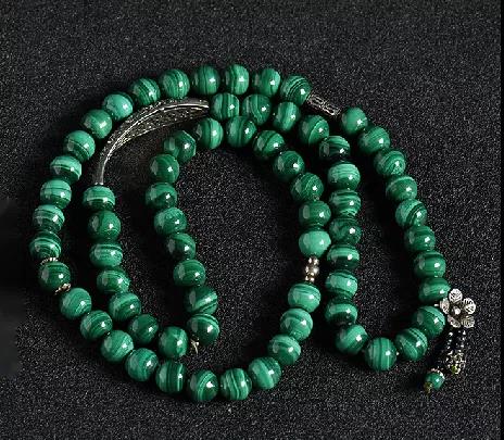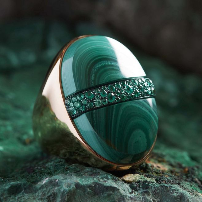 孔雀石也常作为现代饰品的材料,可雕刻鸡心吊坠、蛋形戒面、项链等具有复古色彩的作品,受到了不少年轻人的追捧。某品牌的戒指就以弧面切割孔雀石为主料,镶嵌于金质戒托之中,点缀圆形切割祖母绿,孔雀石的色彩和花纹更凸显了高雅气质。