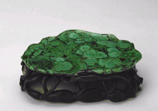 古时的孔雀石作品常带有清雅的气质,如清代孔雀石盘,绿色孔雀石被雕琢成荷叶浅盘,阴刻和浅浮雕的叶脉纹清晰可见,辅以木质透雕的荷花枝为座,亮色盘身与暗色木座相得益彰。