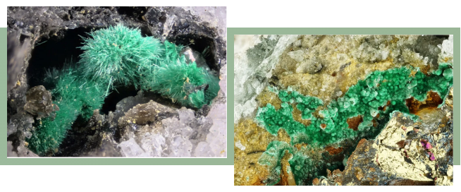 《本草纲目》记载:“石绿生于铜坑内,乃铜之祖气也,铜得紫阳之气而变绿,绿久则成石,谓之石绿。”孔雀石是含铜的碳酸盐矿物,化学式为Cu2(OH)2CO3,一般为铜矿的次生矿物。它的硬度是3.5-4,颜色常见翠绿、暗绿、萤绿、墨绿、碧绿、粉绿、天蓝、浅蓝等,色彩艳丽明快,丰富旖旎。常有纹带,丝绢光泽或玻璃光泽,半透明至不透明。性脆,贝壳状至参差状断口。晶体形态为针状、纤维状,丛生呈簇状、肾状、葡萄状、皮壳状、土状等。