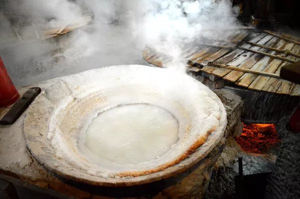 煎盐的锅,古时候叫做“牢盆”,这种牢盆的周长有好几丈,直径也有一丈多,只有两种规格和形制。其中一种是用铁做的,把铁锤打成叶片,再用铁钉铆合,盆的底部像盂那样平,盆深约一尺二寸,接口处经过卤汁结晶后堵塞住,就不会再漏了。牢盆下面砌灶烧柴,灶眼多的能有十二三个,灶眼少的也有七八个,用柴火同时烧煮一个锅。南海地区还有另外一种制法,那是用竹篾编成一个锅围,锅围的直径约一丈、深约一尺。在锅围上糊上蛤蜊灰并衔接在锅的边上。锅下烧火到使卤水沸腾,一直到逐渐结晶成盐。这种盆也叫做“盐盆”,但总的来说不如用铁片做成的锅那样方便省事。煎炼盐卤汁的时候,如果没有即时凝结,可以将皂角捣碎掺和小米糠一起投入沸腾的卤水里搅拌均匀,盐分便会很快地结晶成盐粒。加入皂角而使盐凝结,就好像做豆腐时使用石膏一样。