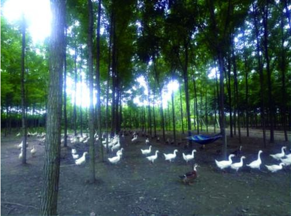 该模式主要是指在郁闭的林下对鸡、鸭、鹅等家禽进行养殖,在养殖时可以采用自然放养或周边设置围栏进行圈养。采用该模式进行养殖,树木可以起到通风、降温作用,有效避免了家禽疫病产生和传染,为家禽提供更健康的栖息环境。家禽活动不会对树木造成破坏,可提高生态系统的稳定性。同时,家禽粪便是优质的有机肥料,可为树木生长持续提供充足营养。