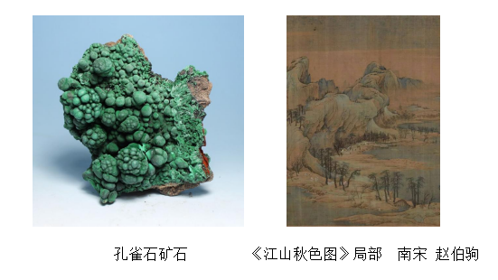 孔雀石颜料根据色彩深浅有头绿、二绿、三绿、四绿等,在埃及金字塔壁画、敦煌壁画及中外大多数绘画中都有出现。青绿山水是中国传统绘画的重要组成部分,是一种典型的工笔重彩表现形式。用呈色稳固、经久不变的矿物质石青、石绿为主色,更显青绿相映,富丽堂皇。