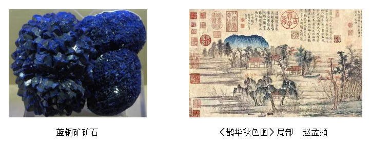 蓝铜矿也称为石青,矿物化学式Cu3[CO3]2(OH)2,浅蓝至深蓝色,属单斜晶系。蓝铜矿常与孔雀石及氯铜矿共存于铜矿床的氧化带中。石青与石绿的原料都产生于同一矿石中,是青绿山水的两大主角。