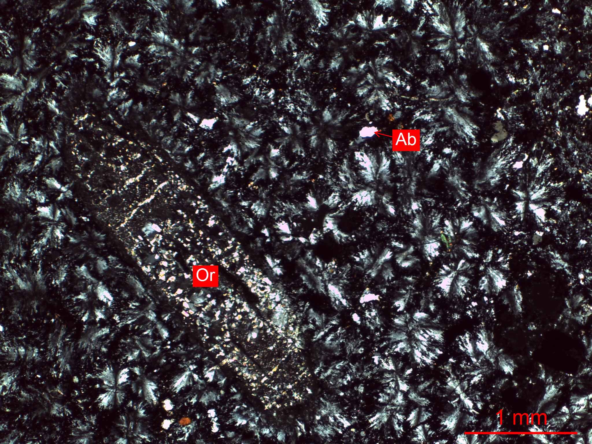 深灰色球粒粗面岩25x(正交偏光+)