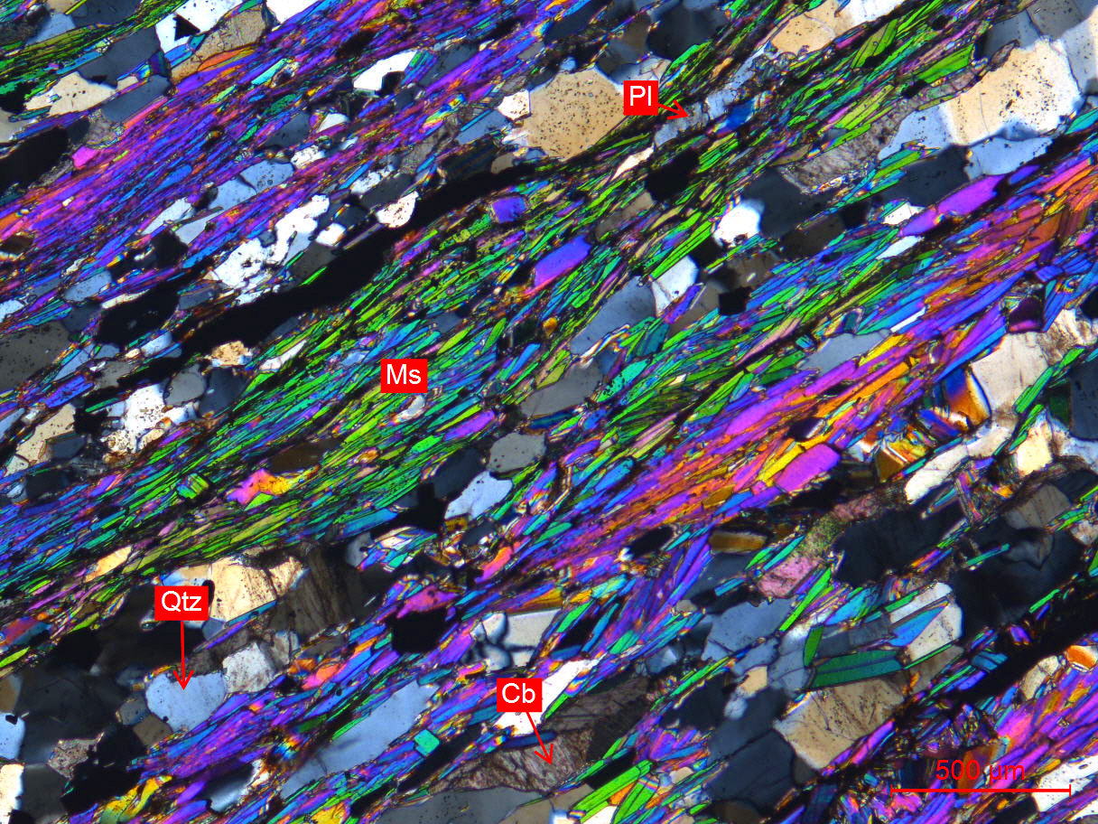 Ms-白云母、Qtz-石英、Cb-碳酸盐、Pl-斜长石
