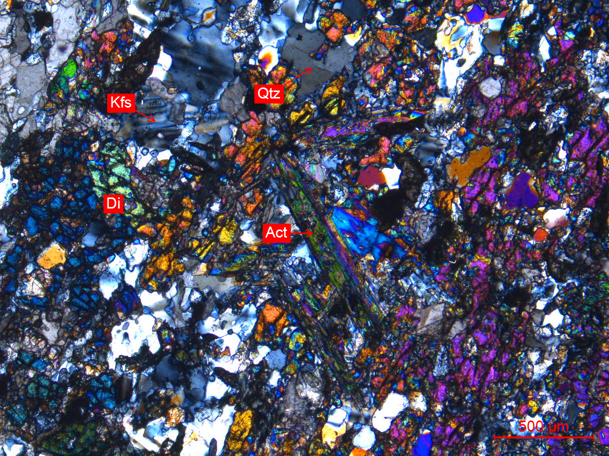 Kfs-钾长石、Di-透辉石、Act-阳起石、Qtz-石英