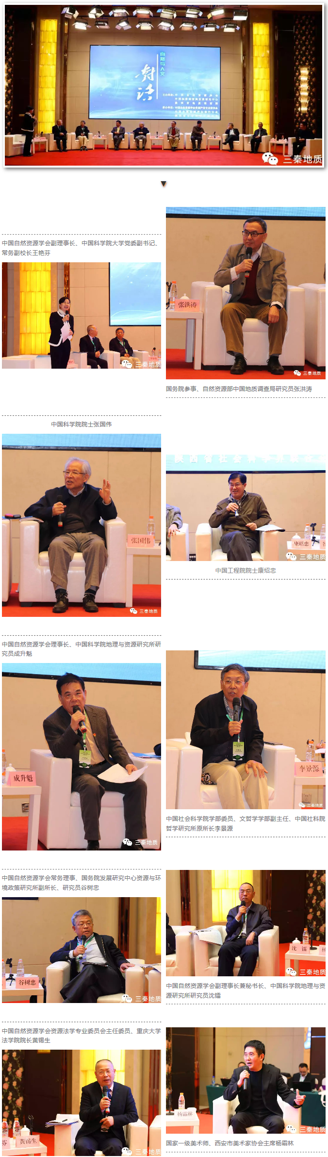 在中国自然资源学会副理事长、中国科学院大学党委副书记、常务副校长王艳芬的主持下,一场聚焦“人与自然和谐共生”的学术盛宴正式开启。来自自然资源与人文领域的院士、专家、艺术家齐聚一堂,进行面对面对话。国务院参事、自然资源部中国地质调查局研究员张洪涛,中国科学院院士张国伟,中国工程院院士康绍忠,中国自然资源学会理事长、中国科学院地理与资源研究所研究员成升魁,中国社会科学院学部委员、文哲学学部副主任、中国社科院哲学研究所原所长李景源,中国自然资源学会常务理事、国务院发展研究中心资源与环境政策研究所副所长、研究员谷树忠,中国自然资源学会副理事长兼秘书长、中国科学院地理与资源研究所研究员沈镭,中国自然资源学会资源法学专业委员会主任委员、重庆大学法学院院长黄锡生,国家一级美术师、西安市美术家协会主席杨霜林分别从哲学、自然科学、社会学、政治学、法学、美学等多个角度分享了自己的观点,专家们各抒己见,畅所欲言,共同为美丽秦巴发展与保护出谋划策。