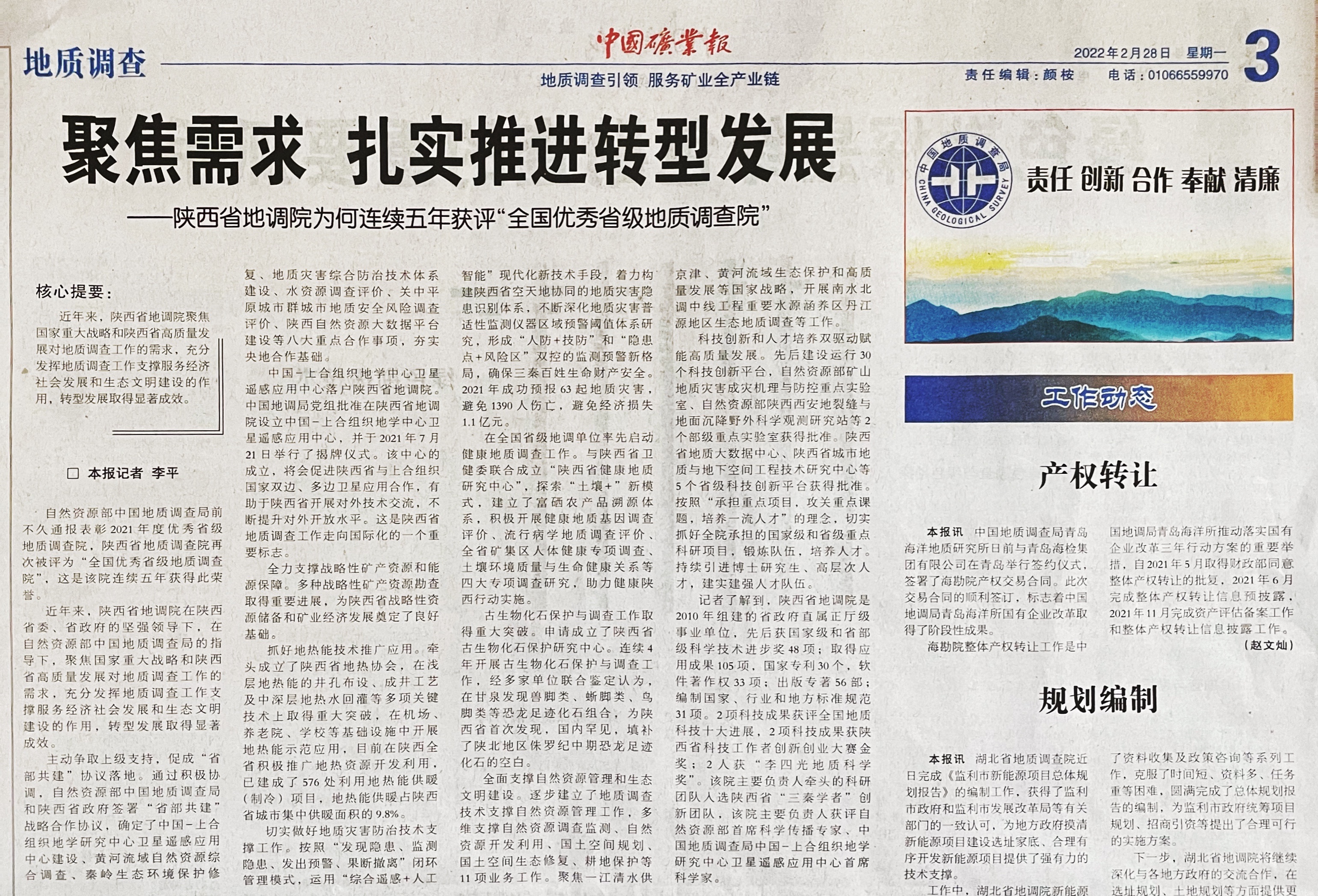 近年来,陕西省地调院聚焦国家重大战略和陕西省高质量发展对地质调查工作的需求,充分发挥地质调查工作支撑服务经济社会发展和生态文明建设的作用,转型发展取得显著成效。