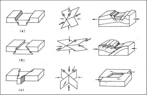 当断层面一旦形成且应力差超过摩擦阻力时,两盘就开始相对滑动,形成断层。根据断层两盘的相对运动方向,可将断层分为正断层、逆断层、走滑断层。三种断层可形成三种不同类型的盆地:裂陷盆地、挤压盆地和走滑盆地(如图)。