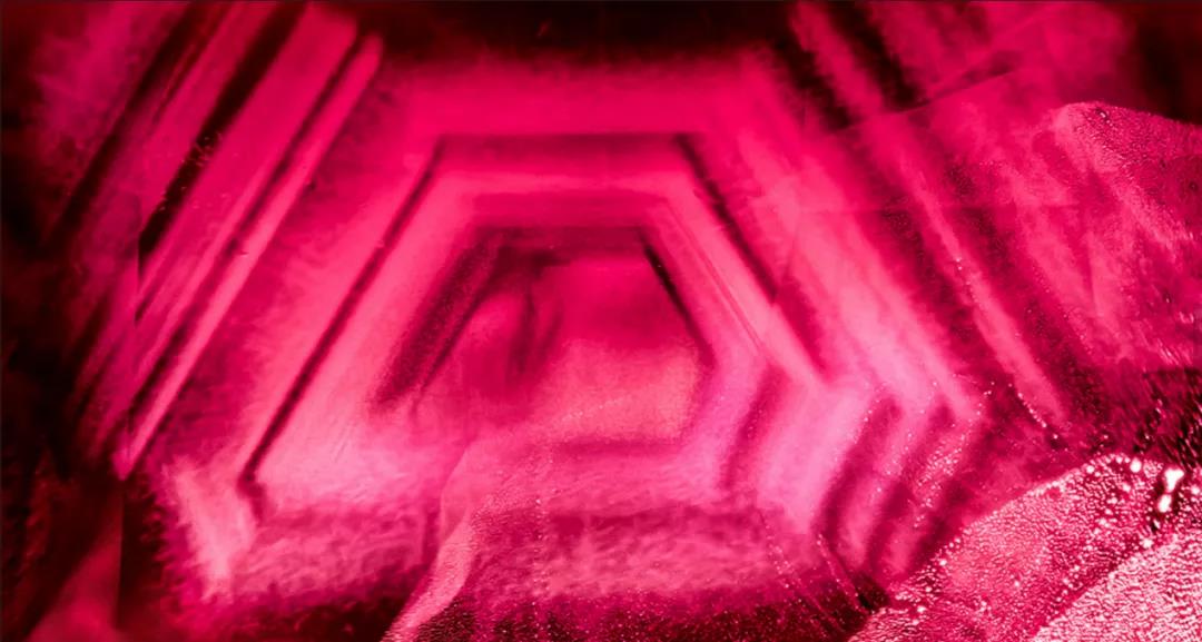下图为缅甸抹谷红宝石经过热处理之后形成的六角形的云雾状外观。