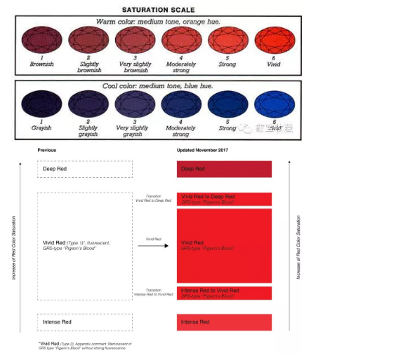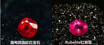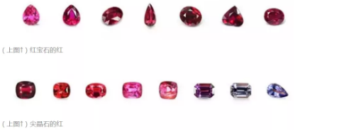 尖晶石是与红宝石最为相似的一类宝石,与红宝石相同,都是由Cr元素致色,折射率为1.718,与红宝石也有着非常相近的折射率,因此与红宝石的外观特别相近,肉眼也很难区分,下图为红宝石与尖晶石的颜色对比。
