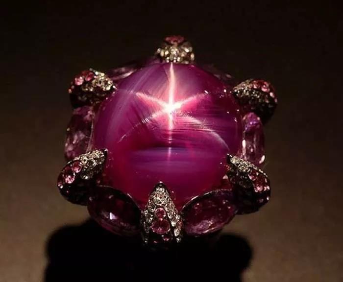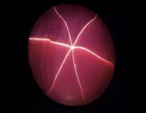 下图为天然的星光红宝石,可以观察到非常明显的平直的六边形色带,星线相对粗壮,六条星线相聚处,形成一个相对较大的光斑,称之为宝光。这在其他类型的宝石中十分少见。