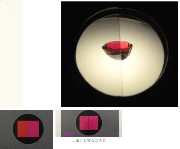 偏光镜下呈现四明四暗;具有明显的二色性,但是二色性与宝石颜色的深浅密切相关,主要为深浅不同的红色、其他色调的红色,如橙红色、紫红色、褐红色、粉红色等。