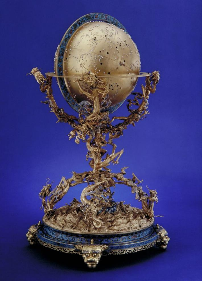 中国神话中,珍珠是南海蛟人的眼泪,传说鲛女是月亮女神嫦娥的侍仆,因为做错事被罚到海里织绡,每逢月圆之夜便站在峭石上,遥望月亮,伤心落泪,落下的泪水便是珍珠。金嵌珍珠天球仪是清代乾隆年间内务府造办处用黄金做成的模型。天球球体用珍珠镶嵌成28星宿、300个星座和2200多颗星,弥足珍贵。